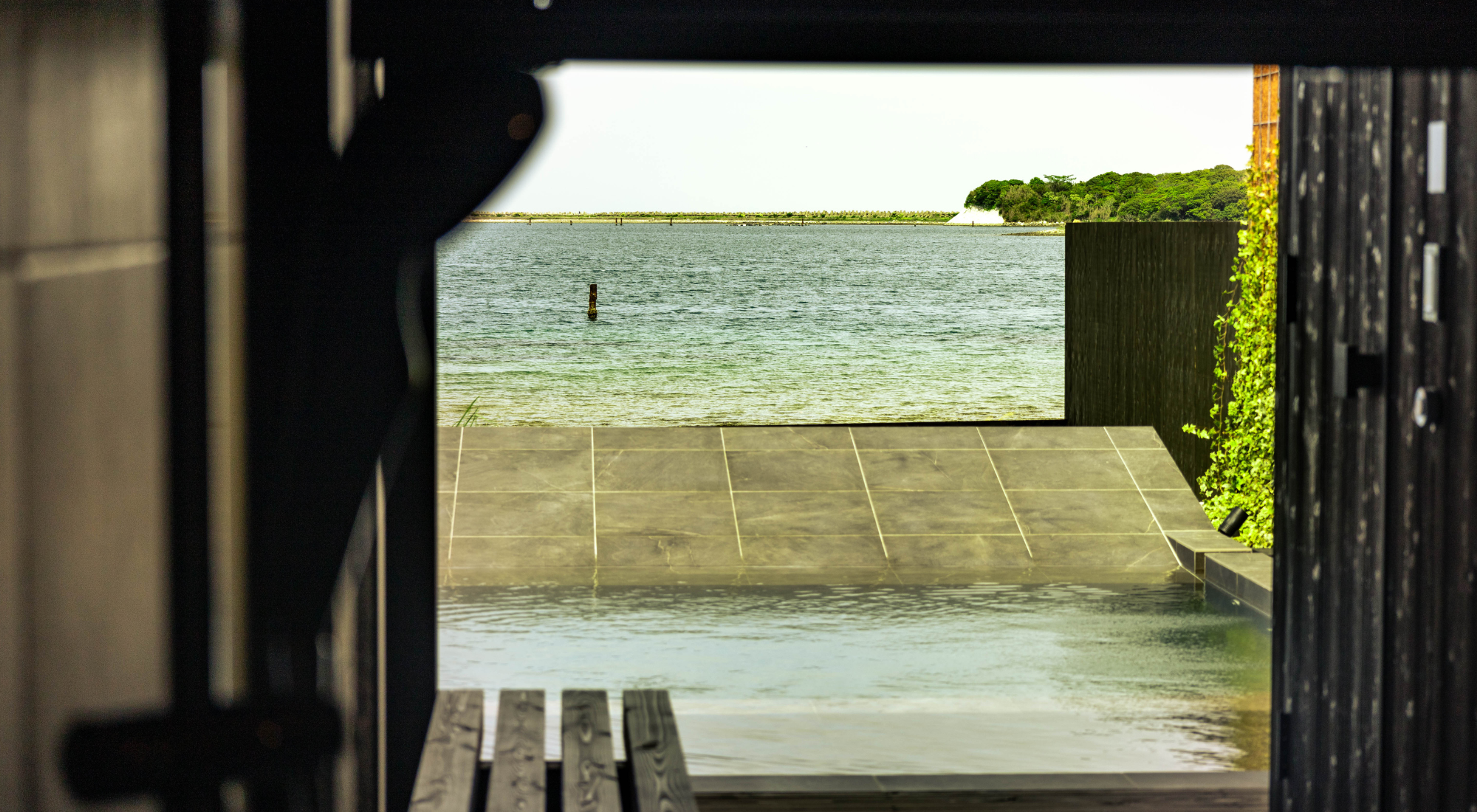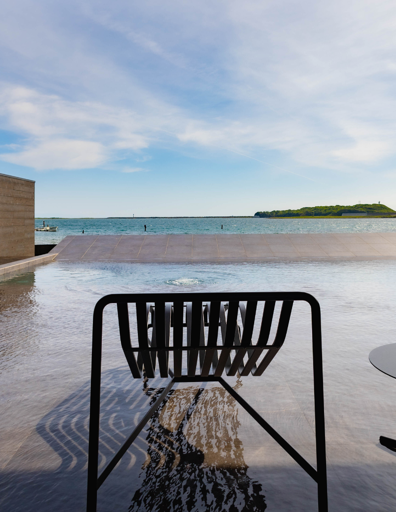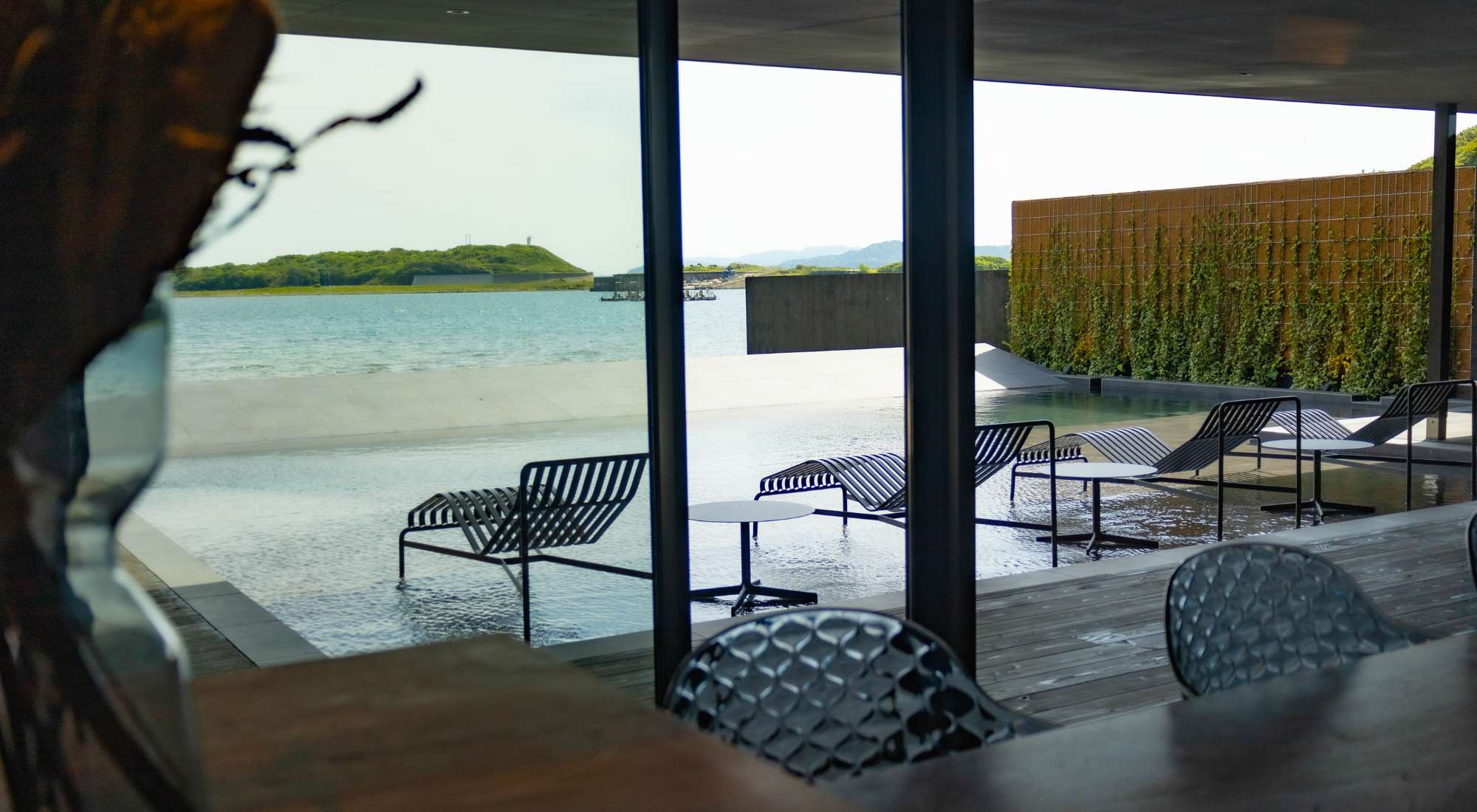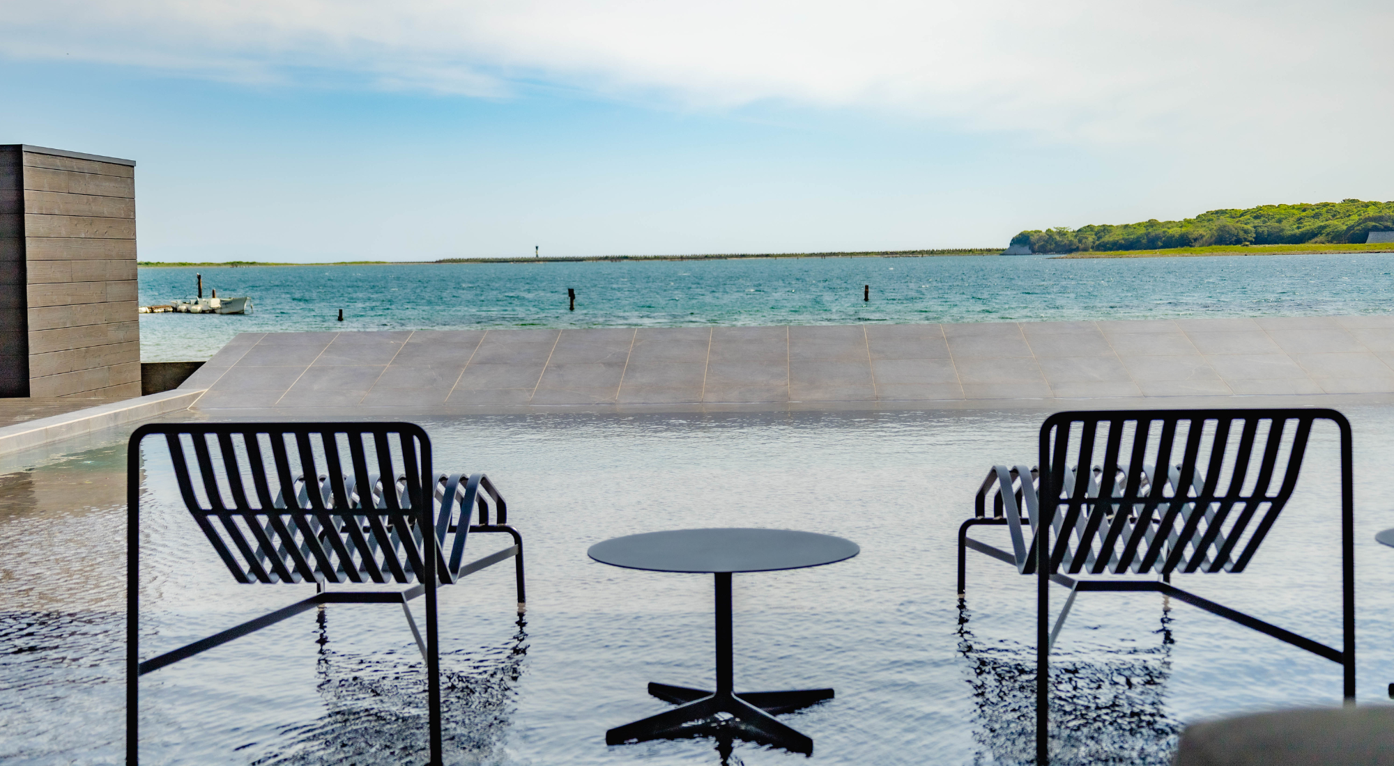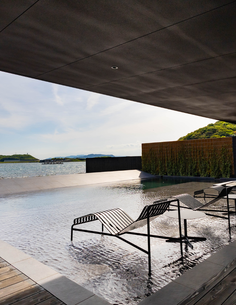 ブラックを基調としたタイルやウッドデッキでLuxuryな雰囲気を漂わせるPool & Terrace。海につながっているように見える傾斜で、海と一体化したかのような感覚に。