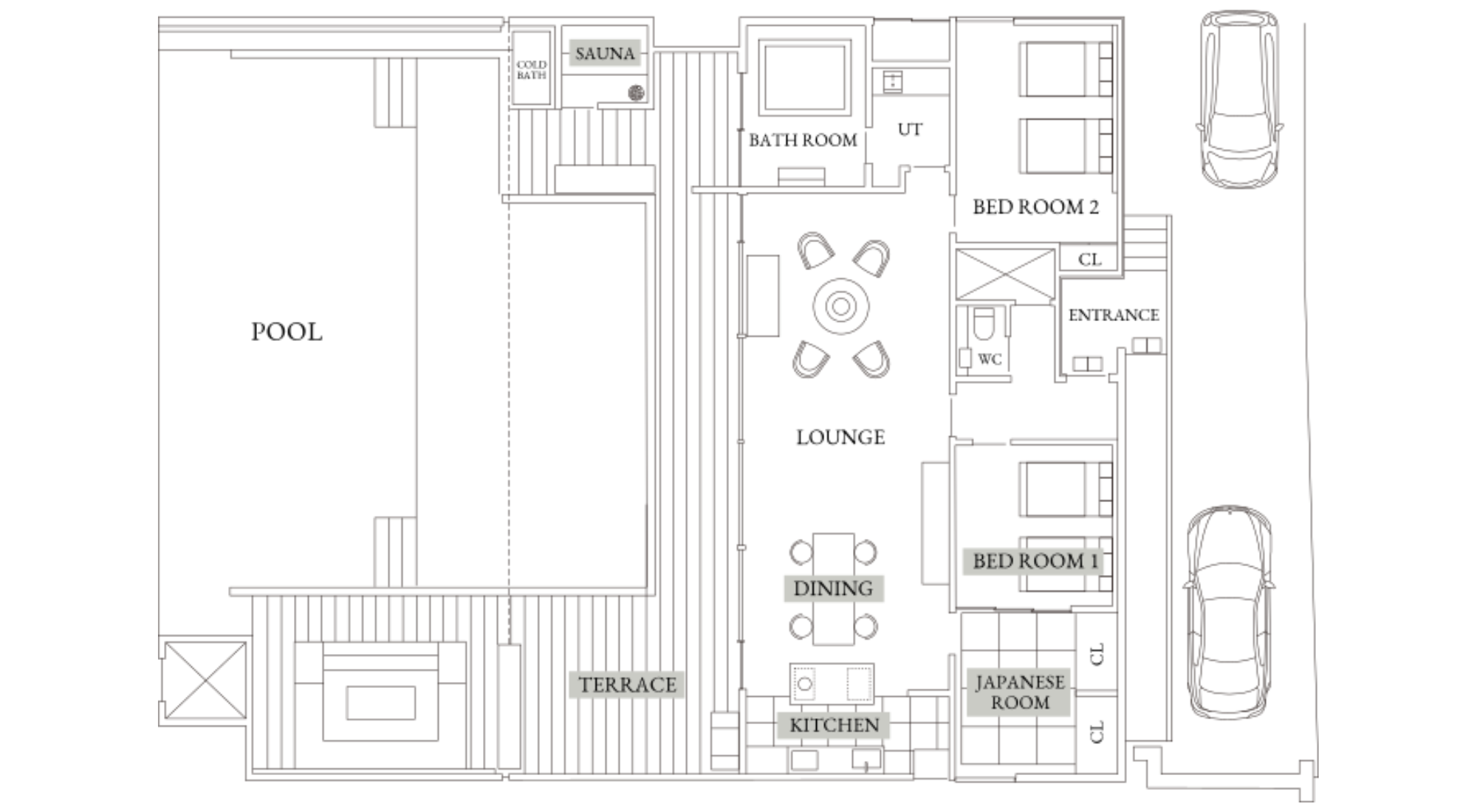 設備:ベッドルーム×2(各セミダブルベッド2台)/ 液晶テレビ60型 / 畳の間(布団4組)/ 電動開閉カーテン / 加湿空気清浄機 / エアコン/ Free Wi-Fi / インフィニティプール / アウトドアリビング / 屋外BBQガスグリル